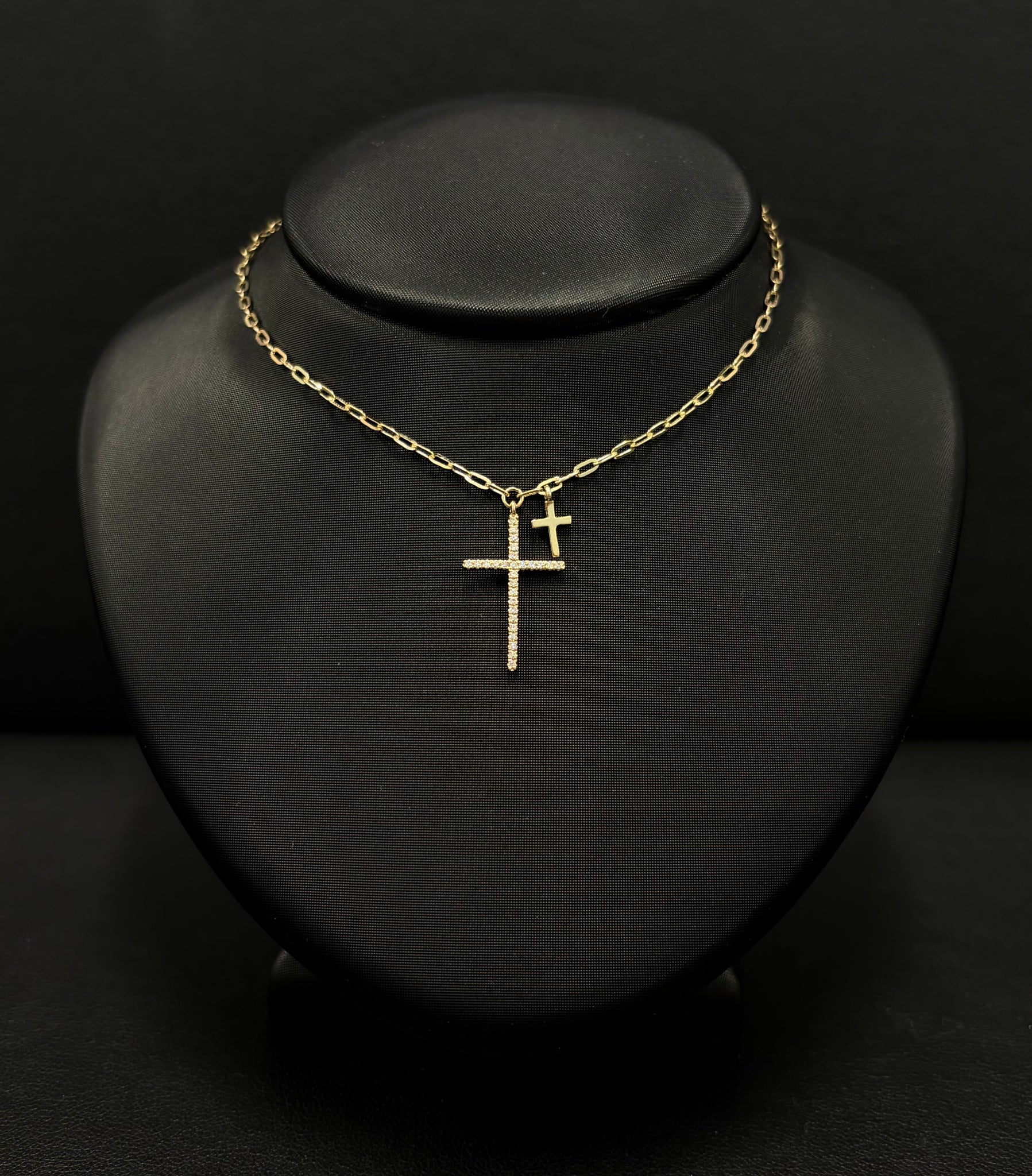 One Ladies 14k Yellow Gold Diamond Cross and Small Gold Cross Pendants on an adjustable 16-18" Paperclip Style Chain. 27 Round Diamonds have a total weight of 0.07 cts.