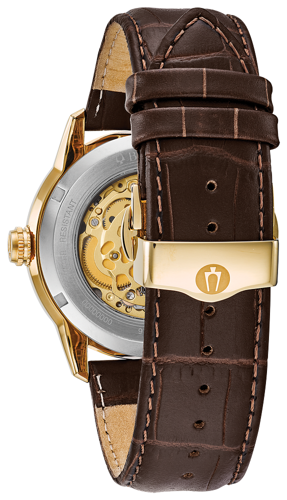 One Gents Stainless Steel Classic Sutton Bulova Watch. Watch has a Full Exhibition Dial with a Brown Leather Strap.
