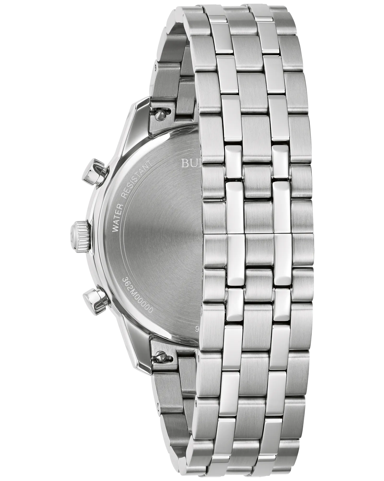 One Gents Stainless Steel 44mm Sutton Chronograph Bulova Watch. Watch has a Silver Tone Dial with Black and Blue Hour Markers on a Stainless Steel Bracelet.