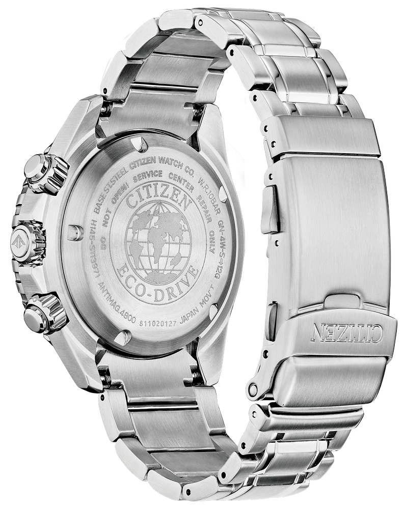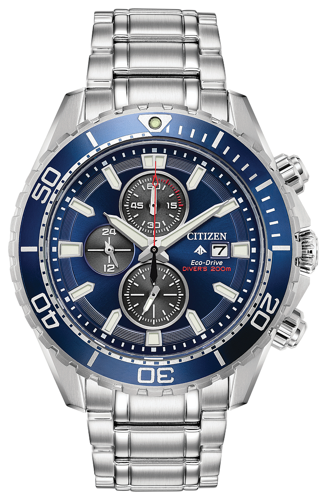 One Gents Stainless Steel Promaster Chronograph Citizen Eco-Drive 200mm Divers Watch with a Round Blue Dial and White Markers on a Stainless Steel Bracelet. Watch has a Mineral Crystal.