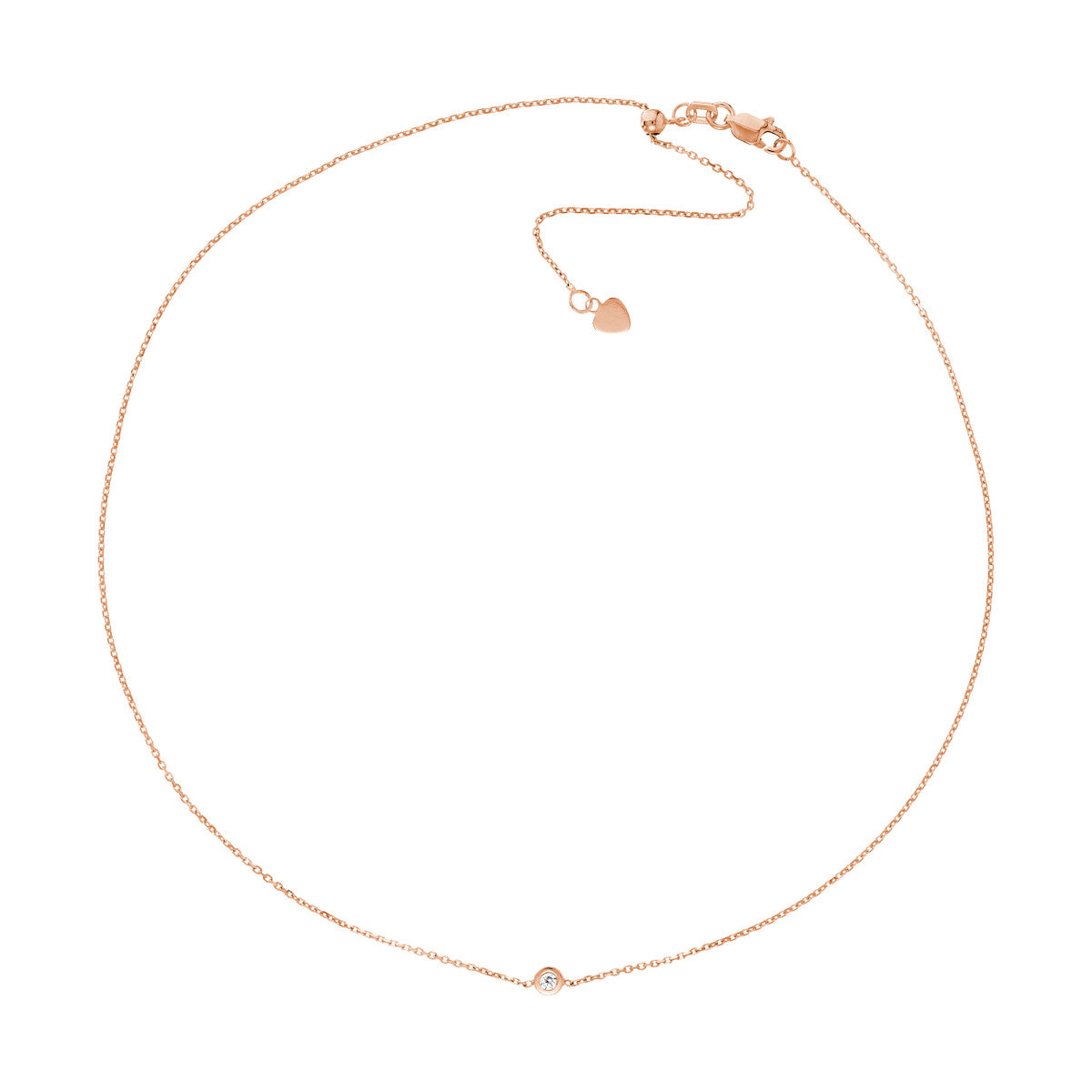 One 14k Rose Gold 16" Bezel Set Choker Necklace on Adjustable Cable Chain. One Round Diamond has a total weight of 0.03 cts.