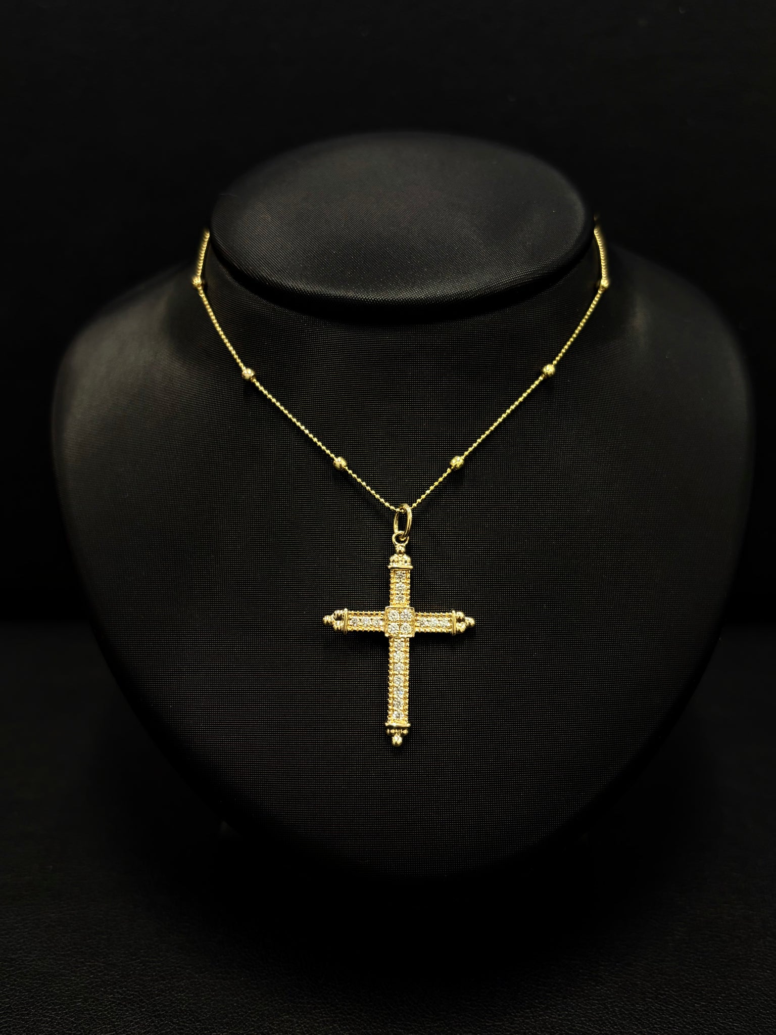 One Ladies 14k Yellow Gold Diamond Cross Pendant on an adjustable Beaded Chain. 20 Round Diamonds have a total weight of 0.23 cts.
