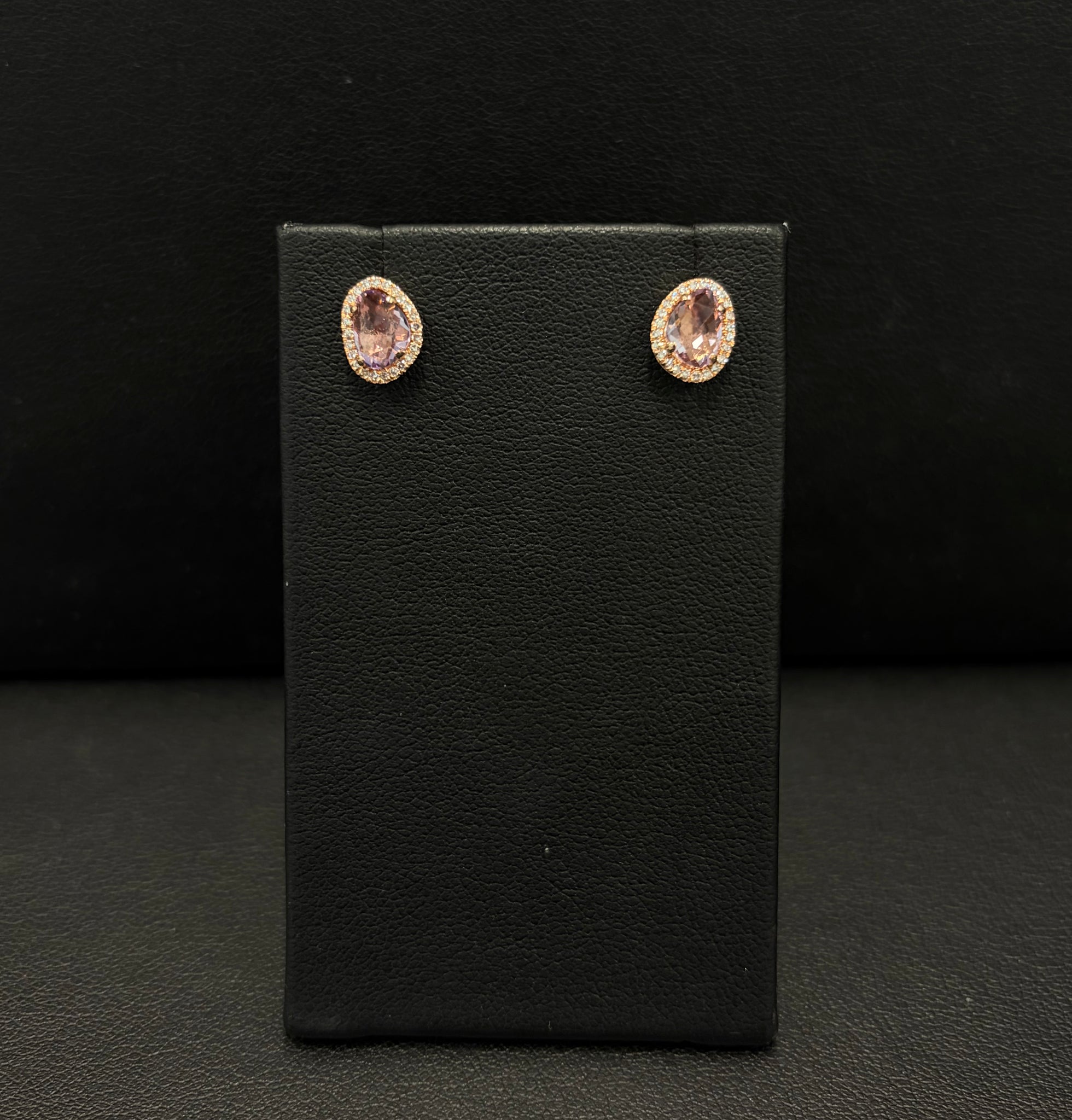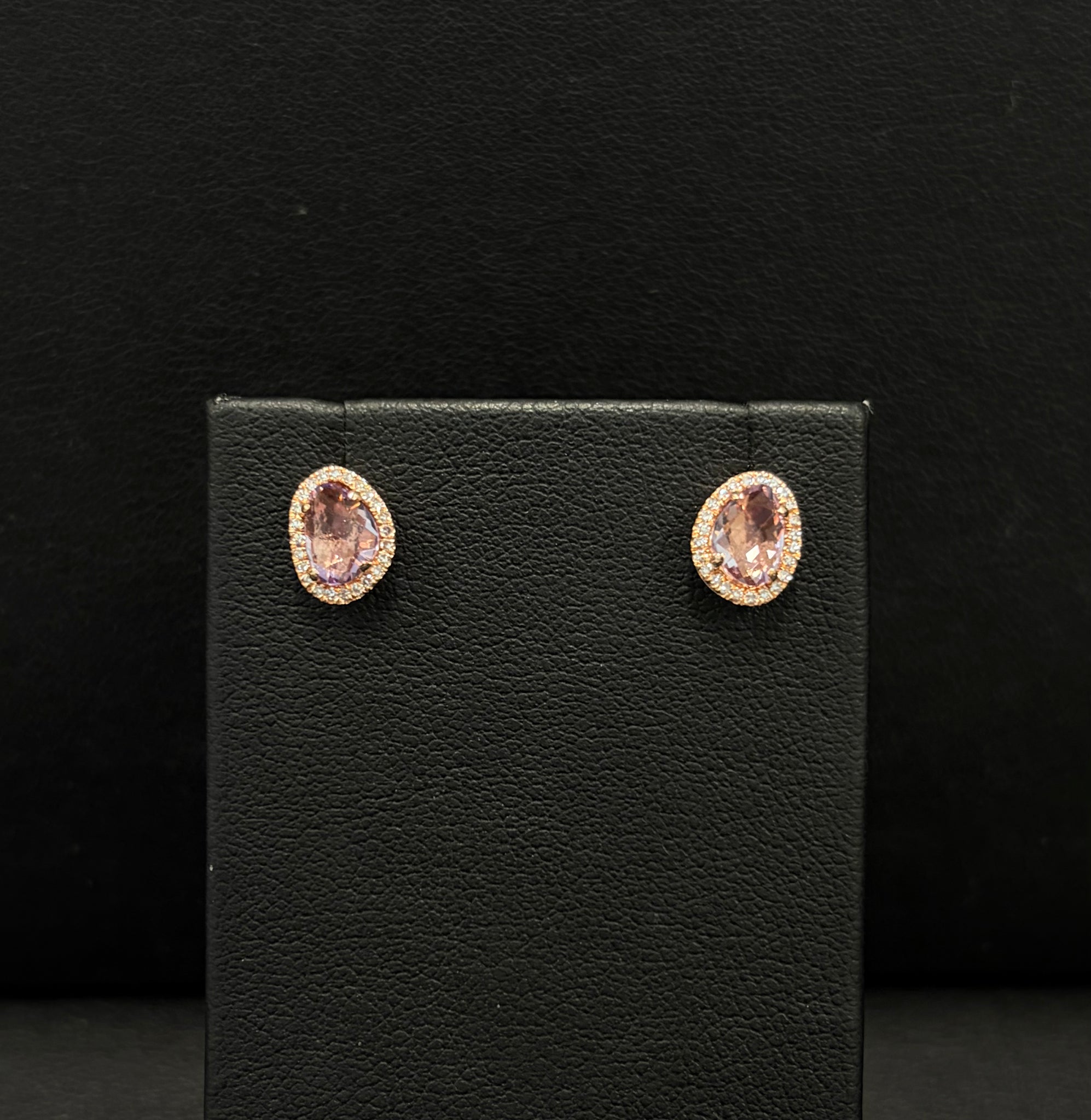 One Pair of Ladies Dilamani 14k Rose Gold Pink Amethyst & Diamond Bean Shaped Earrings. Two Bean Shaped Pink Amethysts have a total weight of 1.03 cts. Also Round Diamonds have a total weight of 0.11 cts.