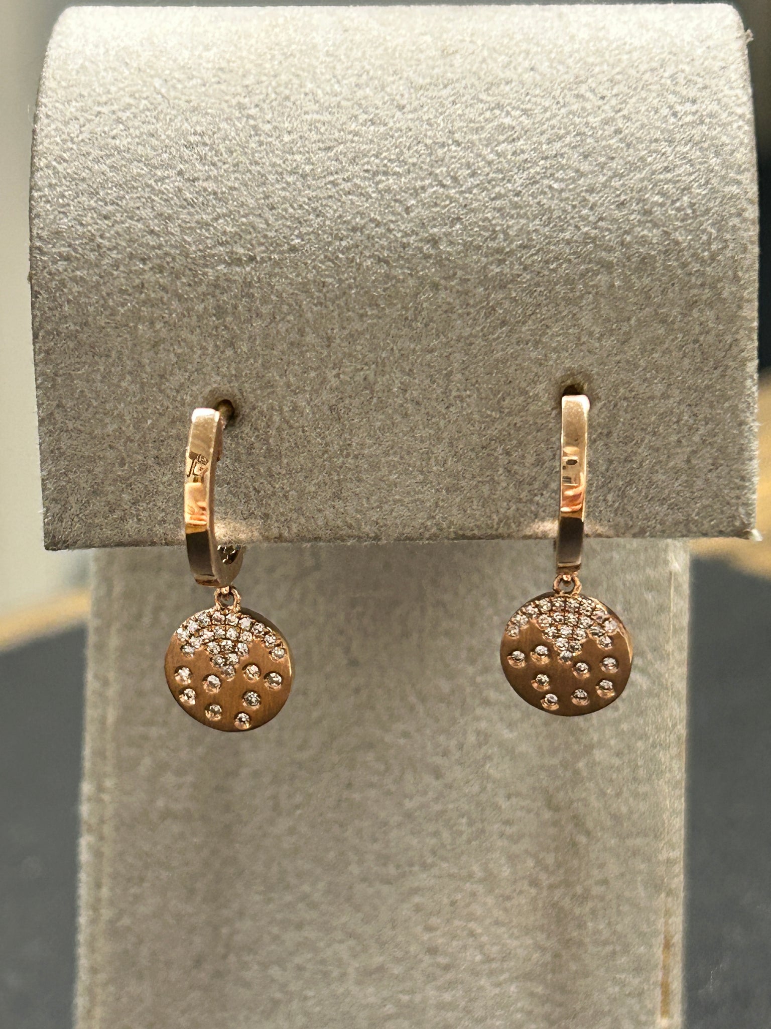 One Pair of Ladies Dilamani 14k Rose Gold Diamond Flush Set Disc Dangle Earrings with a Satin Finish. 60 Round Flush Set Diamonds have a total weight of 0.14 cts.
