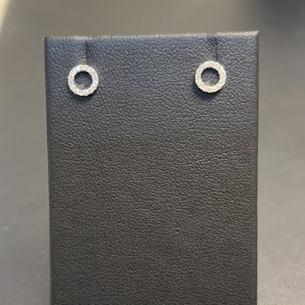 One Pair of Ladies Dilamani 14k White Gold Diamond Open Circle Stud Earrings. 30 Round Diamonds have a total weight of 0.09 cts.