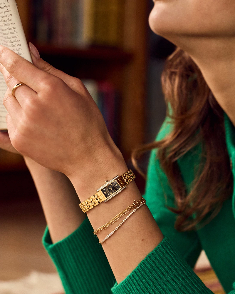 One Ladies Yellow Tone Stainless Steel Citizen Eco-Drive Classic Watch. Watch has a Rectangle Black Dial with Gold Tone Markers and Numbers and a Mineral Crystal. Watch is on a Yellow Tone Stainless Steel Bracelet.