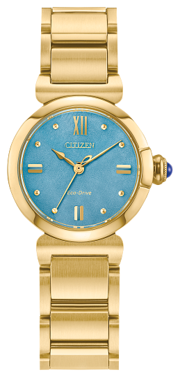 One Ladies Gold Tone Stainless Steel Citizen Eco-Drive Watch. Watch has a Round Opal Color Dial with Two Gold Tone Roman Numerals and Gold Tone Markers and Sapphire on Stem. Watch is on a Gold Tone Stainless Steel Bracelet.