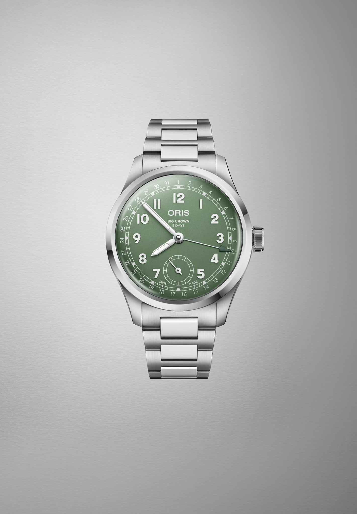 One Gents Big Crown Calibre 403 Watch.Watch is 40mm with a Green Dial and Metalbracelet Steel Strap