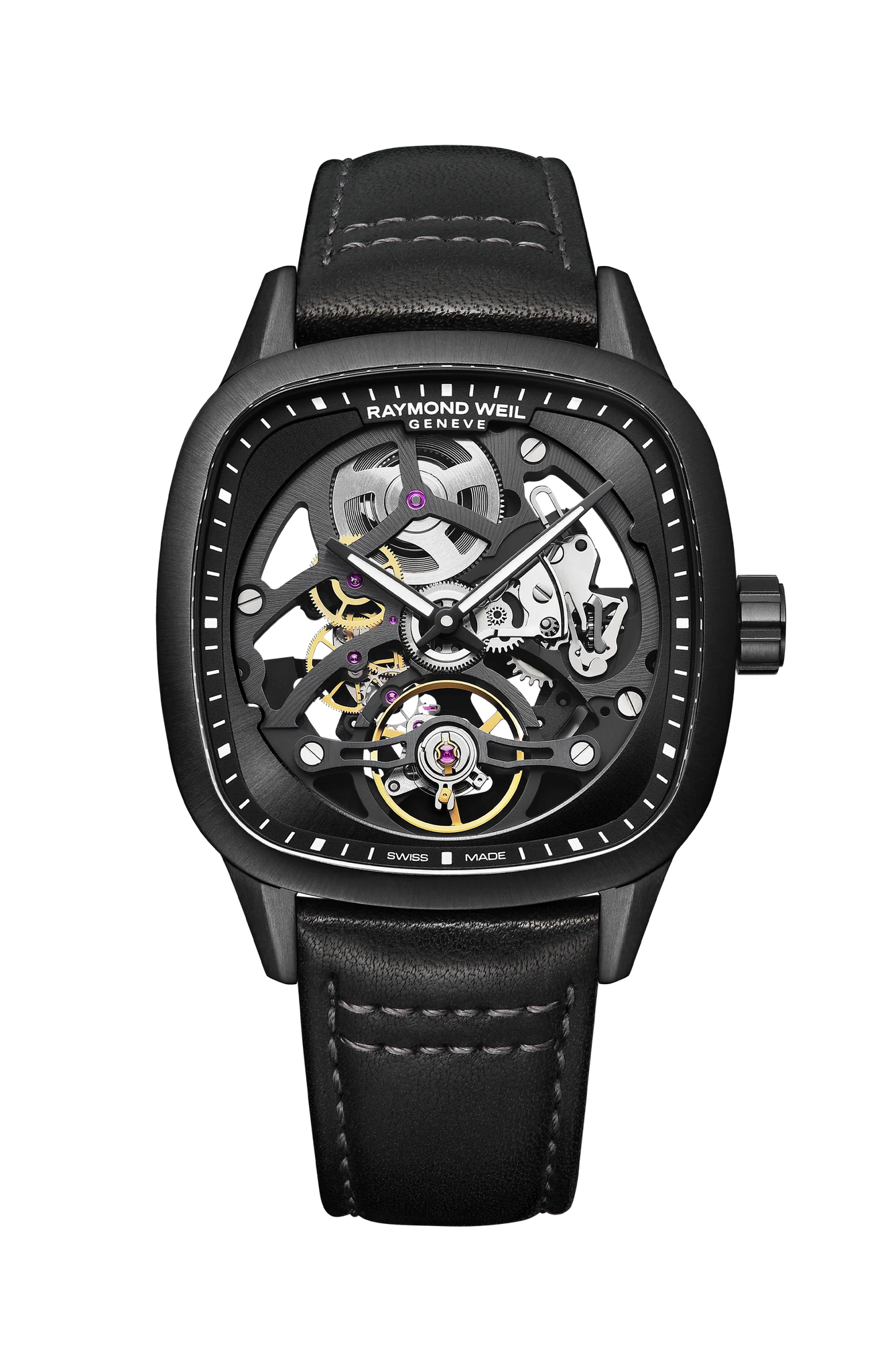 One Gents Limited Edition 40x40mm Raymond Weil Black Skeleton "Freelancer" Calibre Automatic Watch. Watch has a black PVD-coated stainless steel cushion-shaped case, a black galvanic skeleton dial and a modern black leather strap. Watch is limited to 500 pieces.