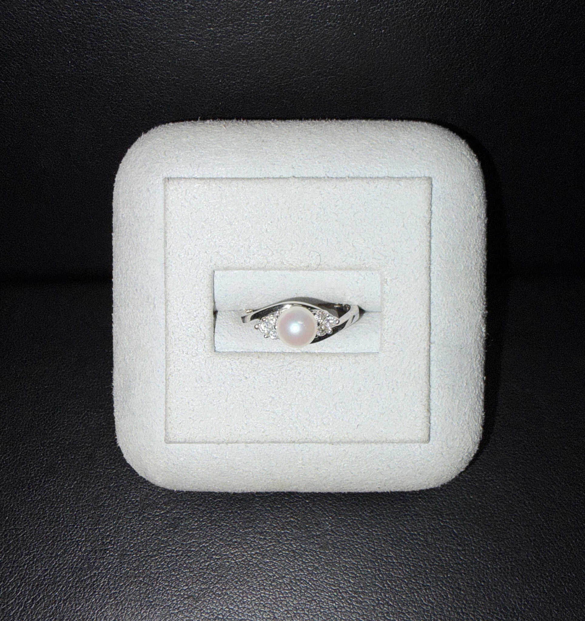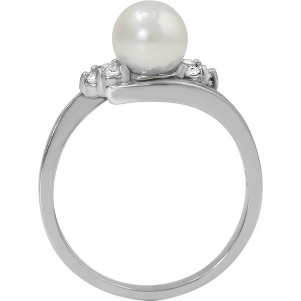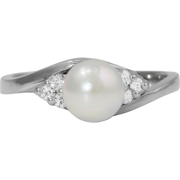 One Ladies 14k White Gold Pearl and Diamond Ring. One Cultured Pearl measures 5-5.5mm and Six Round Diamonds have a total weight of 0.125 cts.