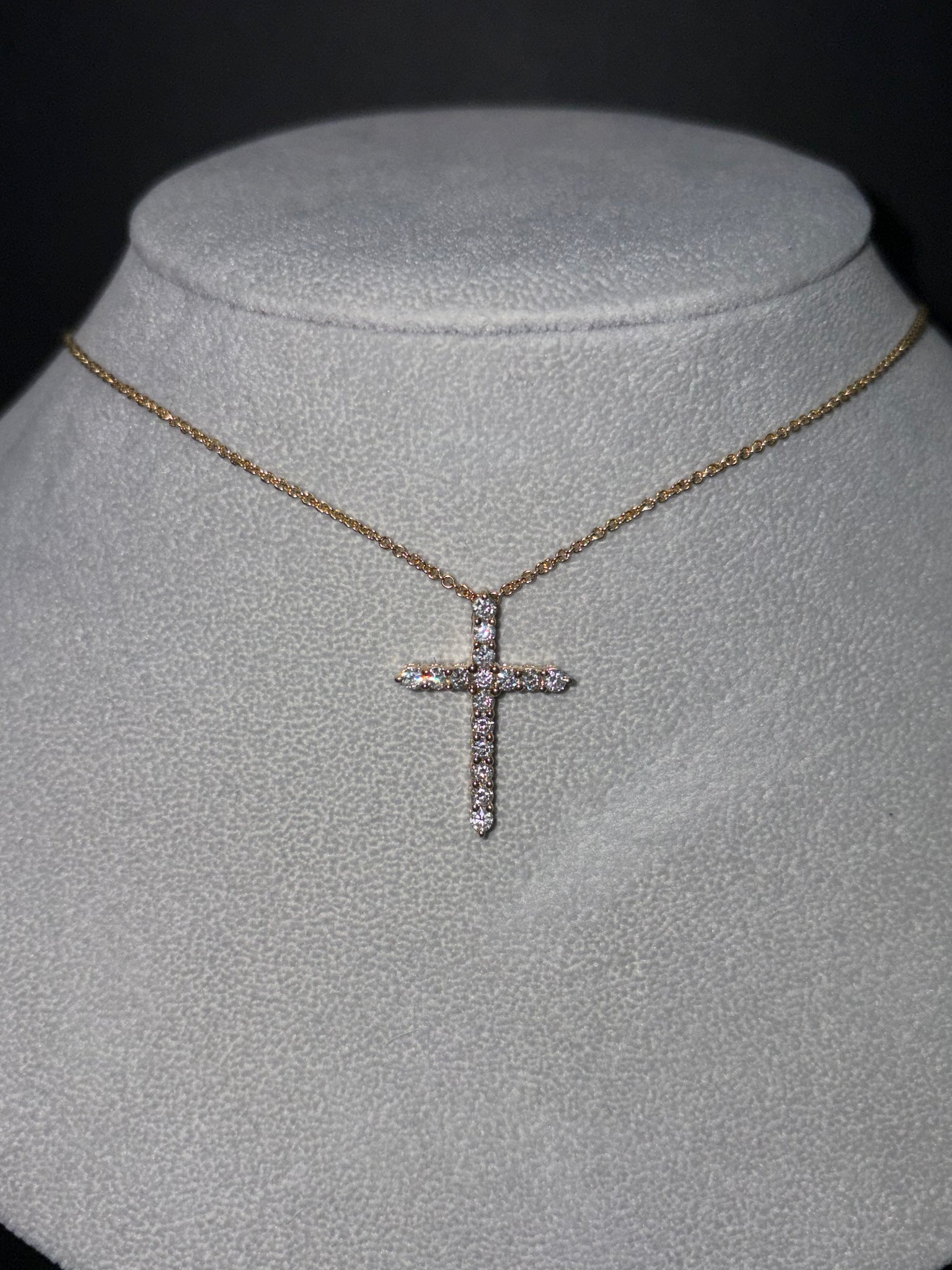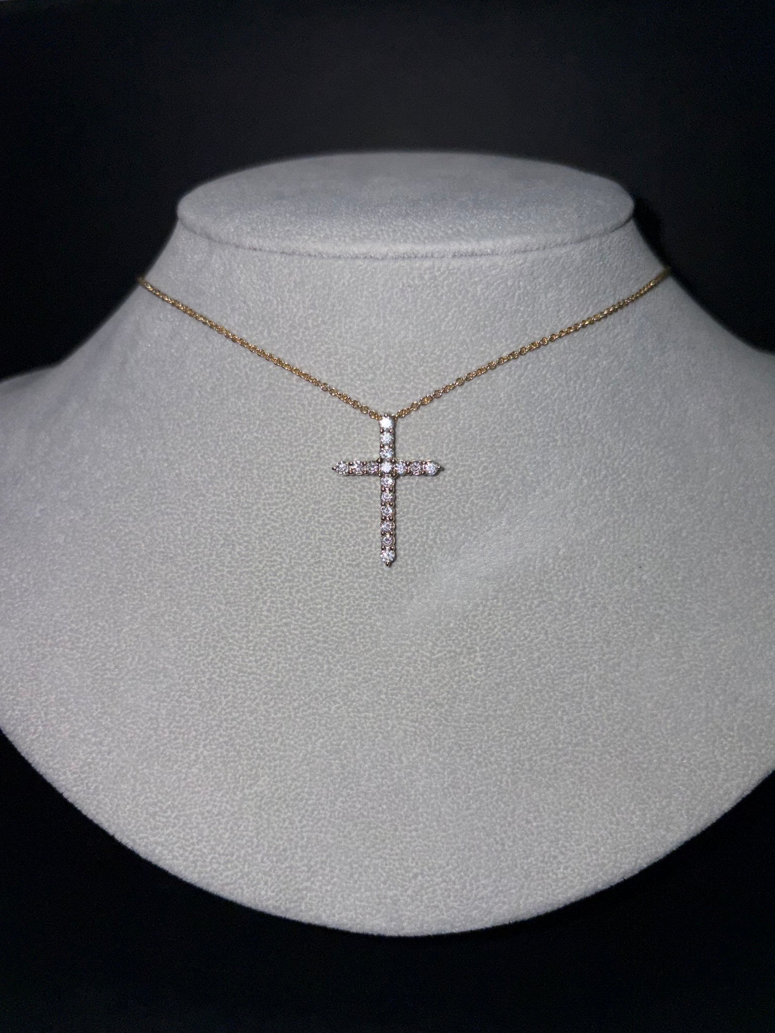 One Ladies 14k Yellow Gold Diamond Cross Pendant on a 16-18" Adjustable Cable Chain. 16 Round Diamonds have a total weight of 0.75 cts.