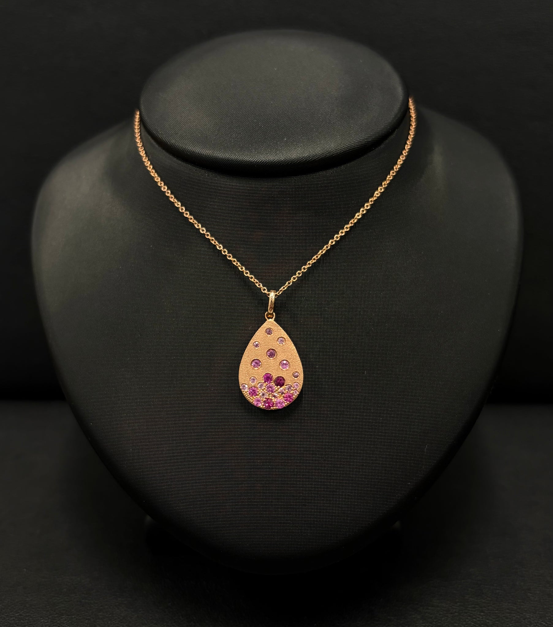 One Ladies Dilamani 14k Rose Gold Pink Sapphire, Ruby and Diamond Flush Set Pear Pendant on a 16-18" Cable Chain. Pink Sapphires and Rubies have a total weight of 0.55 cts. Six Round Diamonds on the bail have a total weight of 0.02 cts.