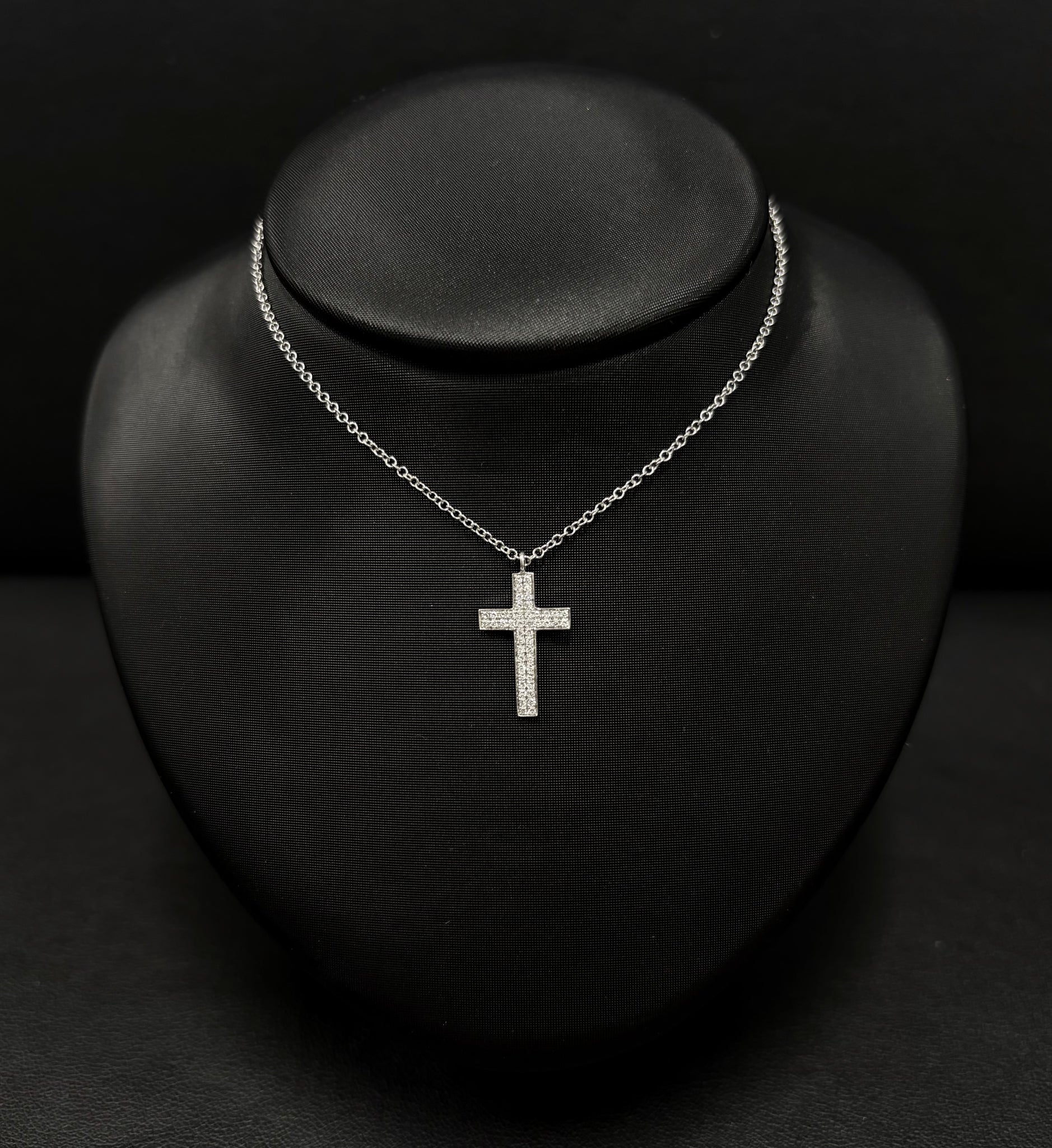 One Ladies 14k White Gold Cross Pendant on a 16" Chain with 2" Extender. 48 Round Diamonds have a total weight of 0.15 cts.